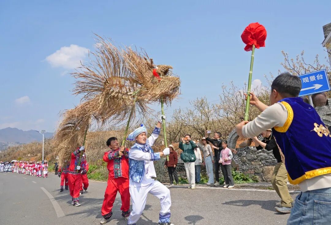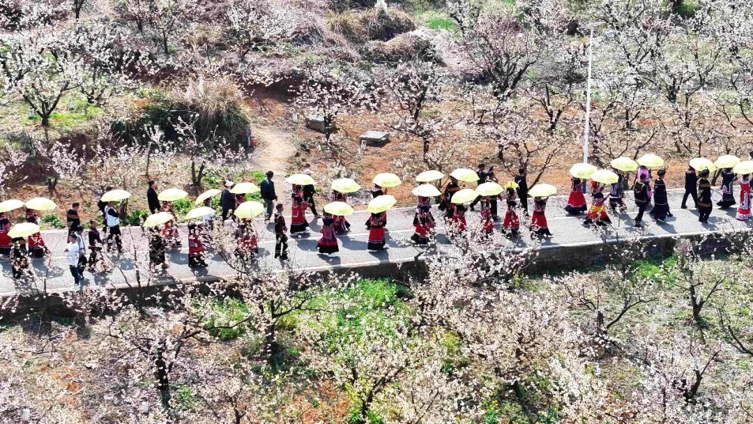 当日午后,总溪河景区七星停车场至游客接待中心广场的道路上,锣鼓喧天,笙歌阵阵。沿途樱桃花竞相绽放,洁白的花海与绚丽的民族服饰交相辉映。浩浩荡荡的巡游队伍,成为花海间最灵动的风景。