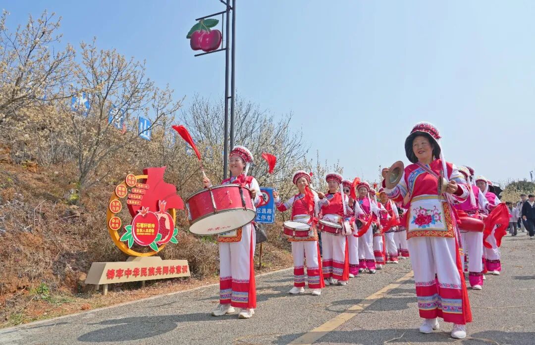 前方开道的彩车插满各色旗帜,车身上“春天在‘纳’里——2026年纳雍县樱桃花节”的标语格外醒目。紧随其后的,是身着盛装的各民族同胞:苗族男子头戴羽冠,手持芦笙踏歌而行,悠扬的曲调在樱桃花林间回荡;白族姑娘们身着绣满精美纹样的彩衣,手持腰鼓轻敲慢舞,鲜艳的裙摆随步伐翻飞,与枝头洁白的樱桃花相映成趣;彝族同胞的甜美歌声在春风里激荡,唱响春日欢歌。