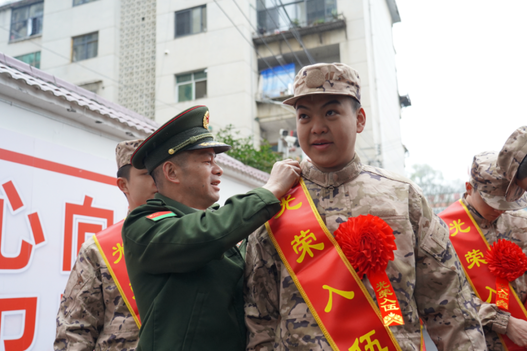 军地领导为新兵佩戴“光荣入伍”大红花和绶带,并为新兵家长颁发“光荣之家”牌匾及入伍奖励金。