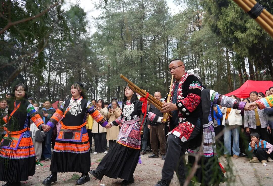 现场,手持芦笙的苗族汉子们环绕花树,吹奏起古老的旋律,脚步或沉稳或灵动,时而踏地前行,时而翻转腾挪,芦笙声如山风穿林,苍劲悠远。身着盛装的苗族姑娘们则踩着节拍,踏歌起舞,百褶裙层层铺展如花绽放,银饰随着舞步叮当作响,仿佛行走的民族史诗在春日里轻声吟唱。围观的群众纷纷举起手机,想要定格这份鲜活与热烈。